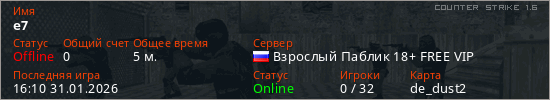 Играет на Counter Strike 1.6 сервере. Страна: РоссияПервый раз замечен 16:03 31.01.2026
