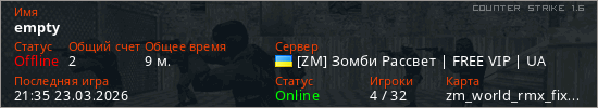 Играет на Counter Strike 1.6 сервере. Страна: УкраинаПервый раз замечен 11:32 22.03.2026