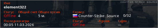 Играет на Counter Strike Source сервере. Страна: РоссияПервый раз замечен 23:55 10.03.2026