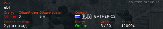 Играет на Counter Strike 1.6 сервере. Страна: РоссияПервый раз замечен 13:42 03.02.2026