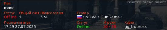 Играет на Counter Strike Source сервере. Страна: РоссияПервый раз замечен 17:22 27.07.2025