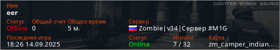 Играет на Counter Strike Source сервере. Страна: РоссияПервый раз замечен 18:19 14.09.2025