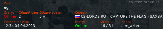 Играет на Counter Strike 1.6 сервере. Страна: РоссияПервый раз замечен 12:32 04.04.2023