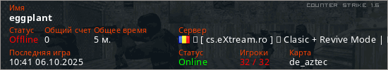 Играет на Counter Strike 1.6 сервере. Страна: РумынияПервый раз замечен 10:39 06.10.2025
