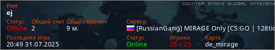 Играет на Counter Strike Global Offensive сервере. Страна: РоссияПервый раз замечен 20:20 31.07.2025
