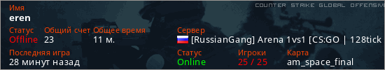 Играет на Counter Strike Global Offensive сервере. Страна: РоссияПервый раз замечен 18:27 05.03.2026