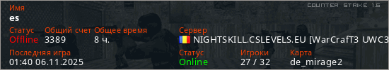 Последний раз был в сети 01:40 06.11.2025 Игрок с таким ником замечен на 20 серверах