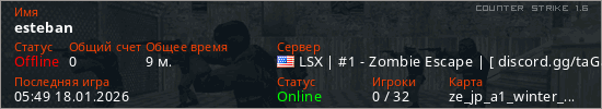 Играет на Counter Strike 1.6 сервере. Страна: СШАПервый раз замечен 02:26 18.01.2026