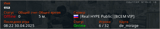 Играет на Counter Strike 1.6 сервере. Страна: РоссияПервый раз замечен 07:57 30.04.2025