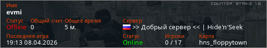 Играет на Counter Strike 1.6 сервере. Страна: РоссияПервый раз замечен 19:11 08.04.2026