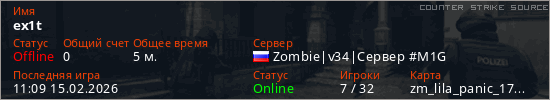 Играет на Counter Strike Source сервере. Страна: РоссияПервый раз замечен 11:05 15.02.2026