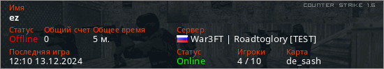 Играет на Counter Strike 1.6 сервере. Страна: РоссияПервый раз замечен 11:01 13.12.2024