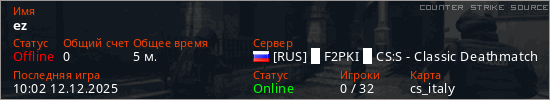Играет на Counter Strike Source сервере. Страна: РоссияПервый раз замечен 09:58 12.12.2025