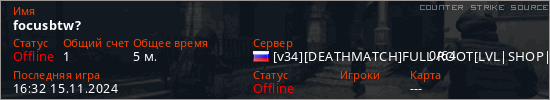 Играет на Counter Strike Source сервере. Страна: РоссияПервый раз замечен 16:30 15.11.2024
