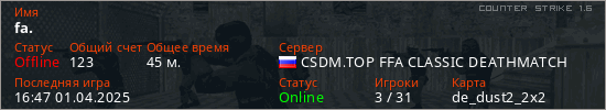 Играет на Counter Strike 1.6 сервере. Страна: РоссияПервый раз замечен 21:18 18.11.2023