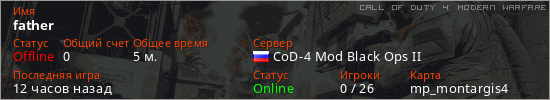 Играет на Call of Duty 4: Modern Warfare сервере. Страна: РоссияПервый раз замечен 20:06 31.12.2025