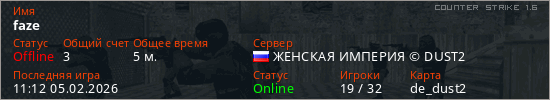 Играет на Counter Strike 1.6 сервере. Страна: РоссияПервый раз замечен 11:10 05.02.2026