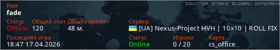 Играет на Counter Strike Global Offensive сервере. Страна: УкраинаПервый раз замечен 20:59 15.04.2026