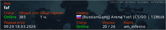 Играет на Counter Strike Global Offensive сервере. Страна: РоссияПервый раз замечен 09:29 18.03.2026