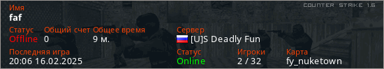 Играет на Counter Strike 1.6 сервере. Страна: РоссияПервый раз замечен 21:05 11.02.2025