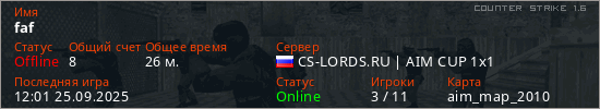 Последний раз был в сети 12:01 25.09.2025 Игрок с таким ником замечен на 14 серверах