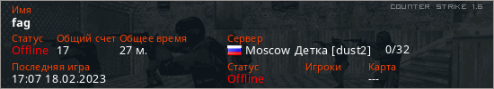 Играет на Counter Strike 1.6 сервере. Страна: РоссияПервый раз замечен 21:17 29.09.2021