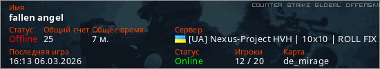 Играет на Counter Strike Global Offensive сервере. Страна: УкраинаПервый раз замечен 15:39 06.03.2026