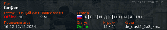Играет на Counter Strike 1.6 сервере. Страна: РоссияПервый раз замечен 17:37 11.12.2024