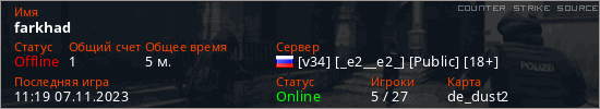 Играет на Counter Strike Source сервере. Страна: РоссияПервый раз замечен 11:15 07.11.2023