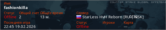 Играет на Counter Strike Global Offensive сервере. Страна: РоссияПервый раз замечен 21:49 16.02.2026