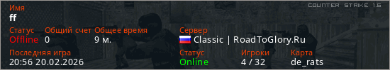Играет на Counter Strike 1.6 сервере. Страна: РоссияПервый раз замечен 01:31 19.02.2026