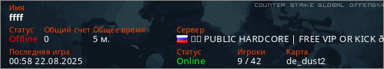 Играет на Counter Strike Global Offensive сервере. Страна: РоссияПервый раз замечен 00:02 22.08.2025