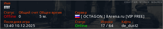 Играет на Counter Strike Source сервере. Страна: РоссияПервый раз замечен 13:18 10.12.2025