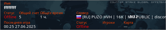 Играет на Counter Strike Global Offensive сервере. Страна: РоссияПервый раз замечен 08:02 16.06.2025