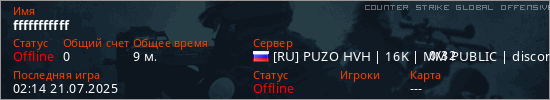Играет на Counter Strike Global Offensive сервере. Страна: РоссияПервый раз замечен 21:07 19.07.2025