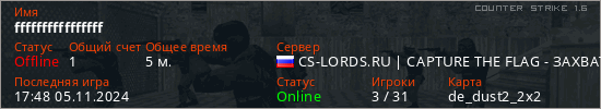 Последний раз был в сети 17:48 05.11.2024 Игрок с таким ником замечен на 7 серверах