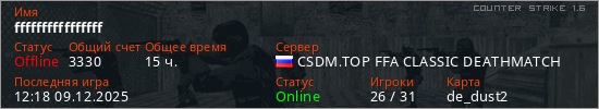 Играет на Counter Strike 1.6 сервере. Страна: РоссияПервый раз замечен 04:06 03.12.2021