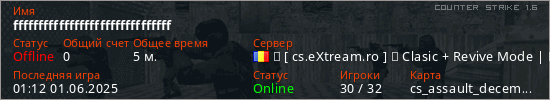 Играет на Counter Strike 1.6 сервере. Страна: РумынияПервый раз замечен 01:05 01.06.2025