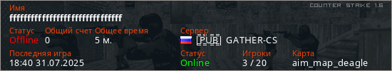 Играет на Counter Strike 1.6 сервере. Страна: РоссияПервый раз замечен 18:31 31.07.2025