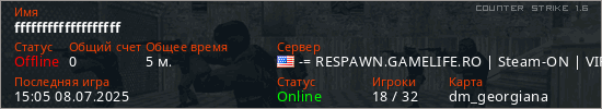 Играет на Counter Strike 1.6 сервере. Страна: СШАПервый раз замечен 14:47 08.07.2025