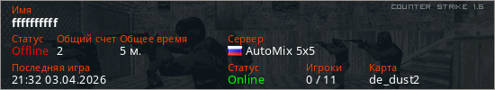 Играет на Counter Strike 1.6 сервере. Страна: РоссияПервый раз замечен 21:30 03.04.2026