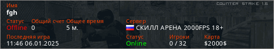 Играет на Counter Strike 1.6 сервере. Страна: РоссияПервый раз замечен 11:44 06.01.2025