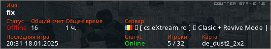 Играет на Counter Strike 1.6 сервере. Страна: РумынияПервый раз замечен 19:22 10.12.2024