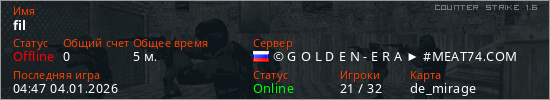 Играет на Counter Strike 1.6 сервере. Страна: РоссияПервый раз замечен 03:42 04.01.2026