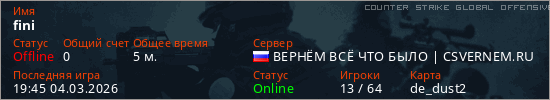Играет на Counter Strike Global Offensive сервере. Страна: РоссияПервый раз замечен 19:43 04.03.2026