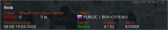 Играет на Counter Strike 1.6 сервере. Страна: РоссияПервый раз замечен 04:04 19.03.2026