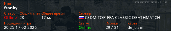 Играет на Counter Strike 1.6 сервере. Страна: РоссияПервый раз замечен 20:43 08.02.2026