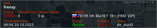 Играет на Counter Strike 1.6 сервере. Страна: РоссияПервый раз замечен 09:47 20.10.2025