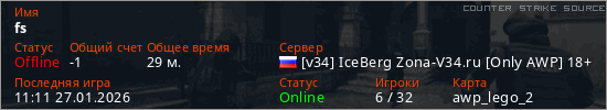 Играет на Counter Strike Source сервере. Страна: РоссияПервый раз замечен 12:09 26.01.2026
