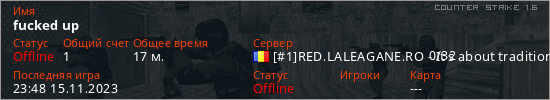 Играет на Counter Strike 1.6 сервере. Страна: РумынияПервый раз замечен 19:51 15.11.2023